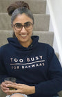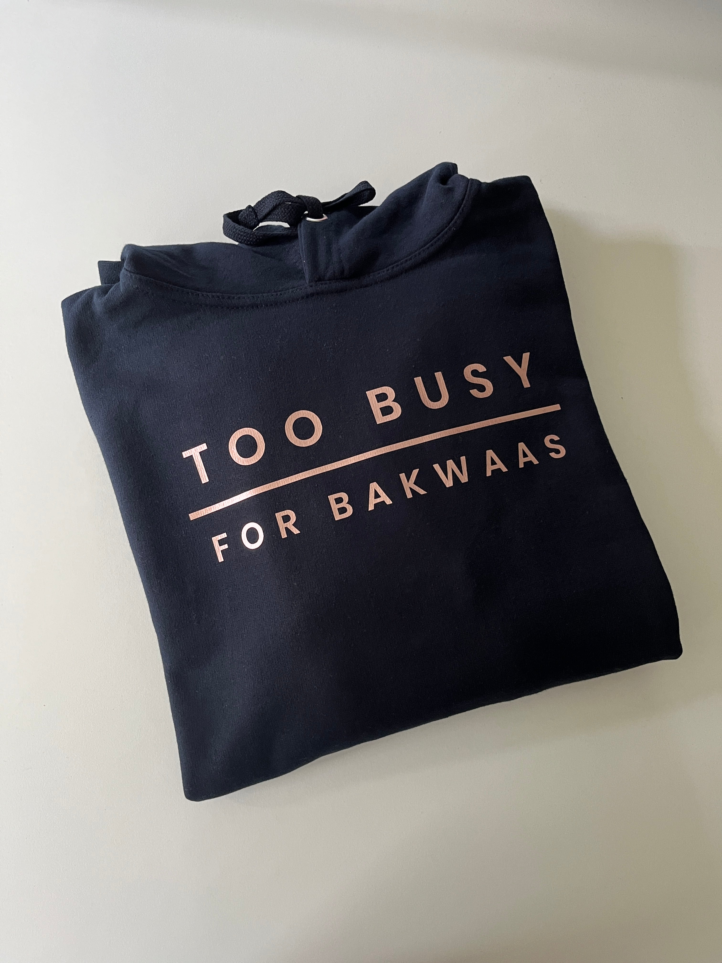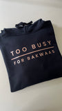 Too Busy For Bakwaas Navy Hoodie with Rose Gold Print
